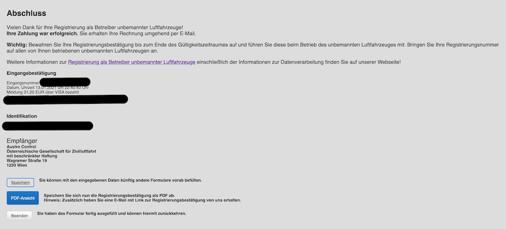 Sodala, seit 01.01.2021 kann man sich bei der Austrocontrol auf deren Dronespace.at Webseite als Drohnenpilot für 32,20€ registrieren in der kleinsten Kategorie.