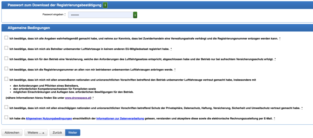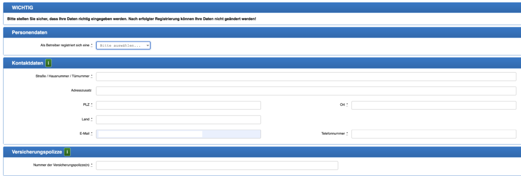 4. Dann muss einiges ausgefüllt sein und die Nummer der Versicherungspolizze sollte man bereit haben (daher wichtig eine Drohnen Versicherung abschließen die auch gleich die Versicherungspolizzen Nummer zur Verfügung stellt und nicht 3 Wochen später per Post schickt 🙂
