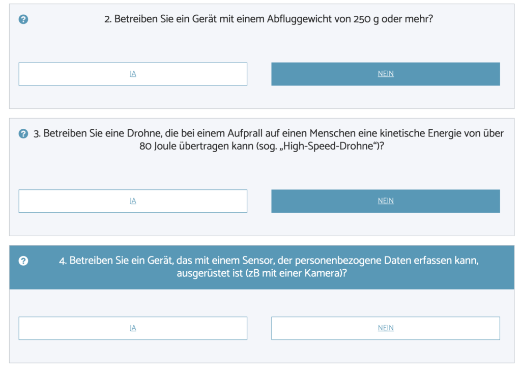 Für die DJI Mavic Mini Flieger und Selberbauer mit leichten Drohnen < 250 Gramm kommen dann noch diese 2 Fragen, die dann darauf hinauslaufen das man seine Drohne bzw. sich selbst sowieso registrieren muss, weil entweder >80 Joule Bewegungsenergie oder eben ein Sensor (= Kamera) drauf ist.
